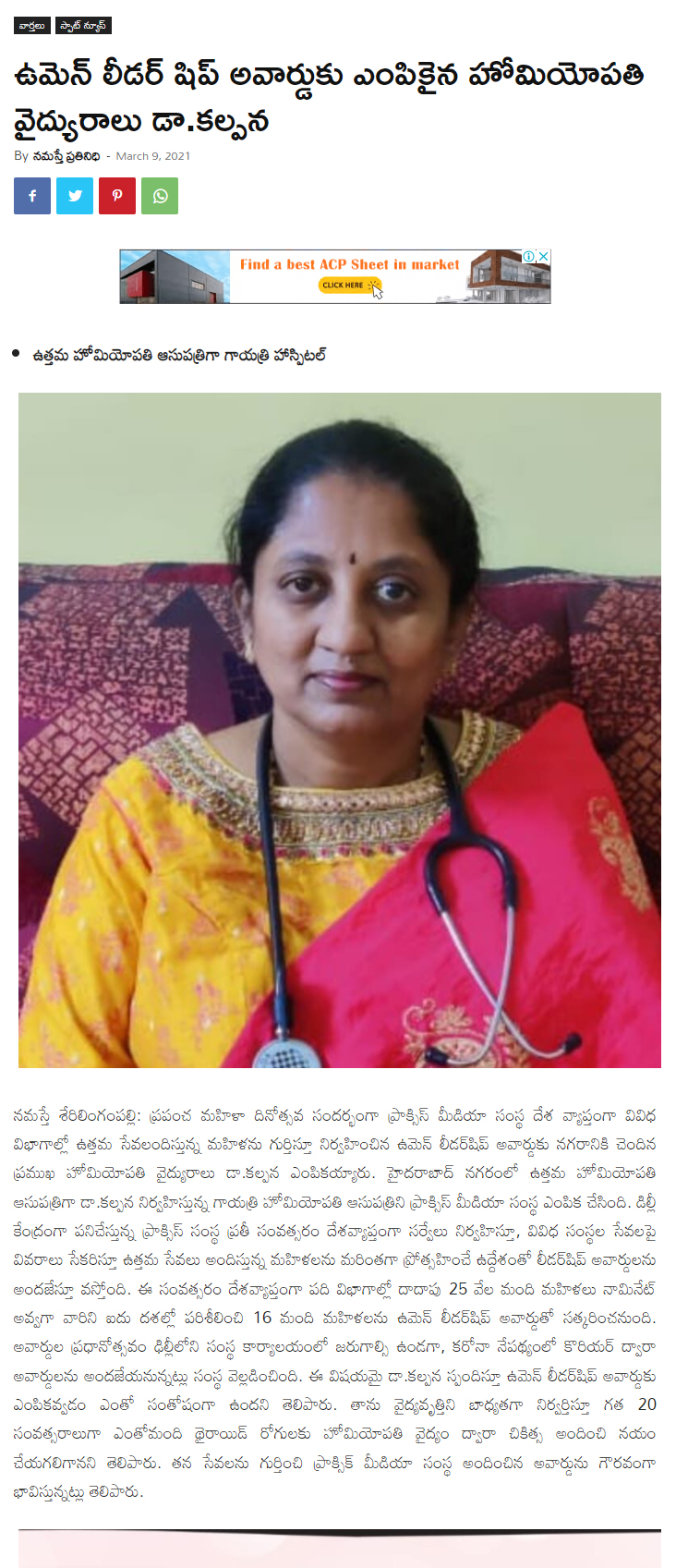 Dr. Kalpana selected for praxis media women leadership award